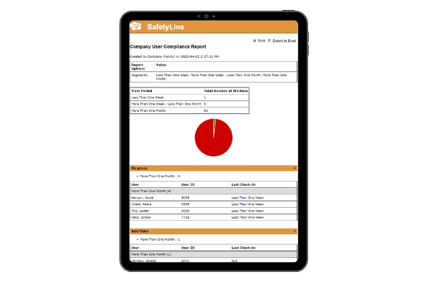 Streamlined compliance and reporting: With its powerful reporting features, employers can maintain compliance easier, with less work required. If safety compliance needs to be established, SafetyLine can provide the necessary documentation and customized data required.