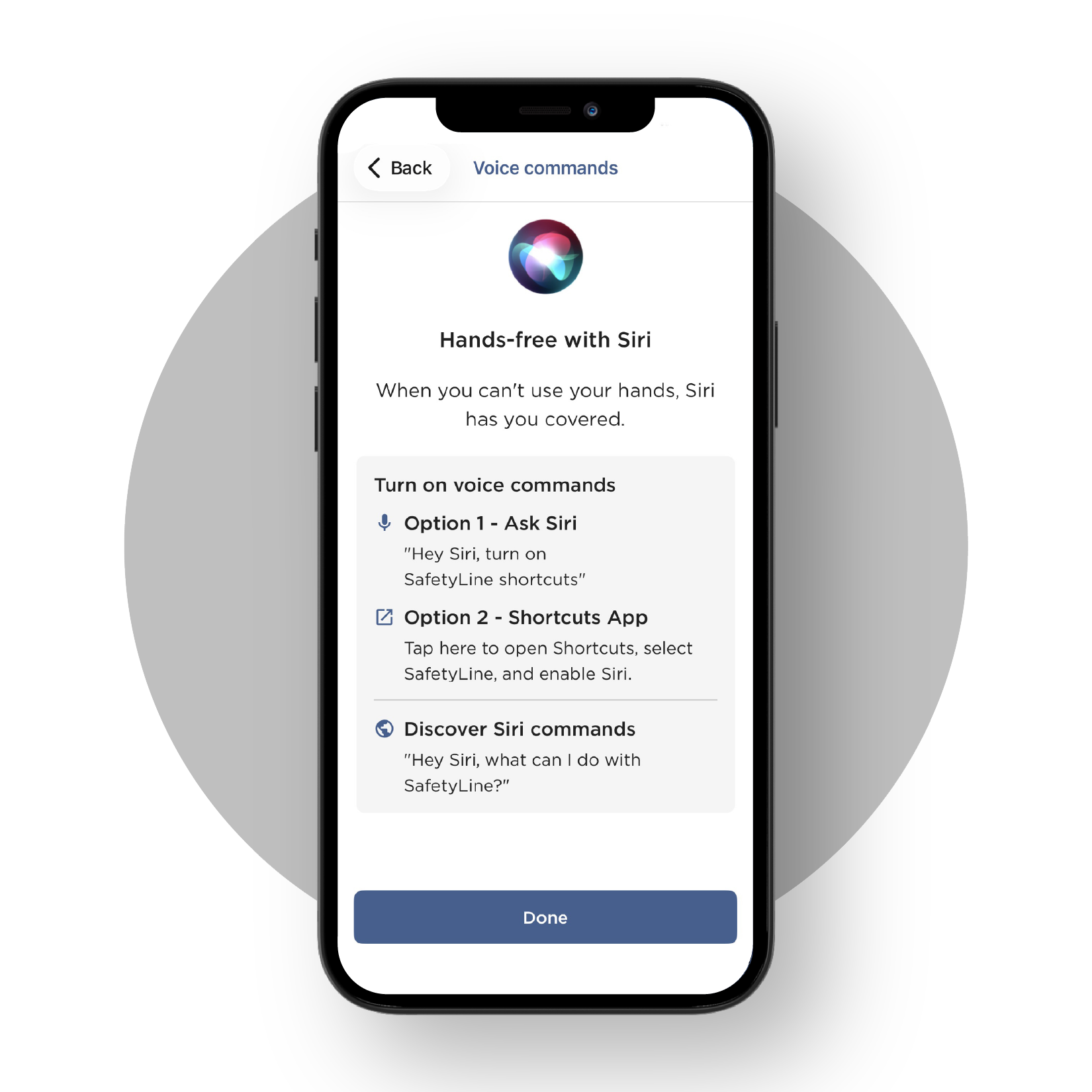 SafetyLine integrates with Siri to enable hands‑free voice commands on iOS devices. Workers can confirm their safety using a simple voice command, reducing distractions and supporting safer check‑ins when screens or hands aren’t available.